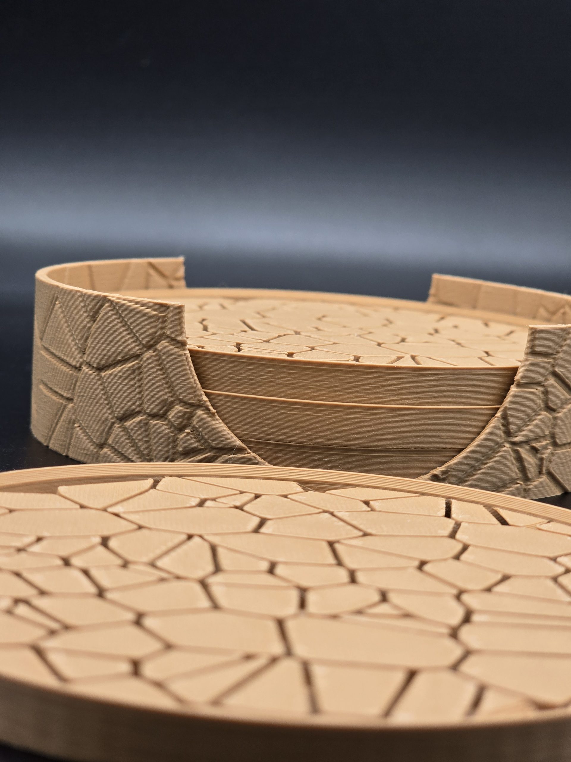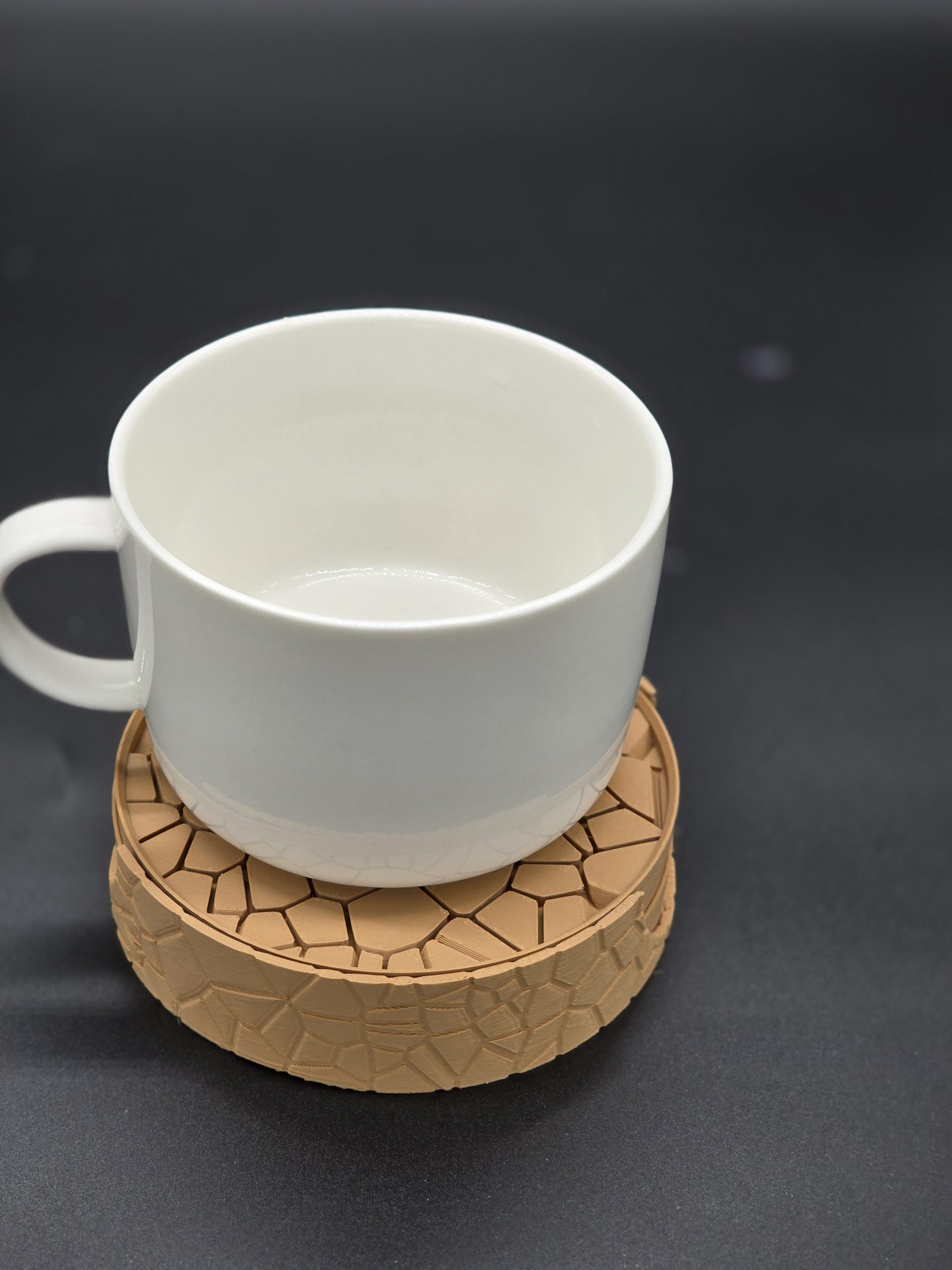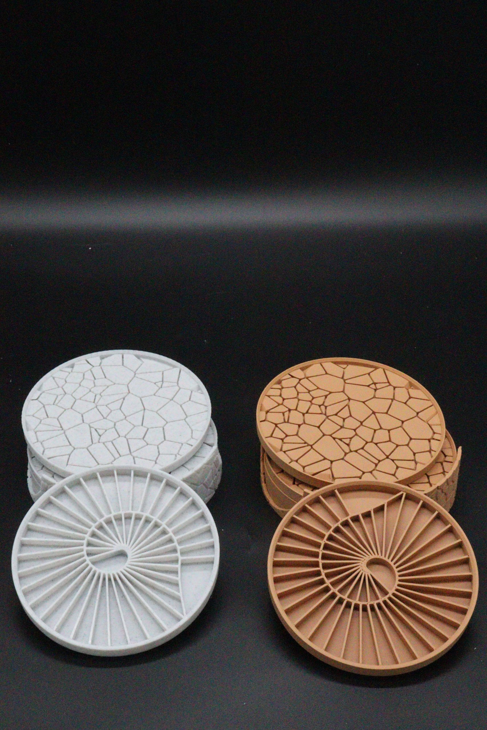 - “Tired of boring coasters? This one-of-a-kind 3D-printed design is a work of art for your tabletop. Each piece features a distinct, cobblestone-like texture that’s both unique and stylish. Perfect for gifting or for adding a custom touch to your own space.”