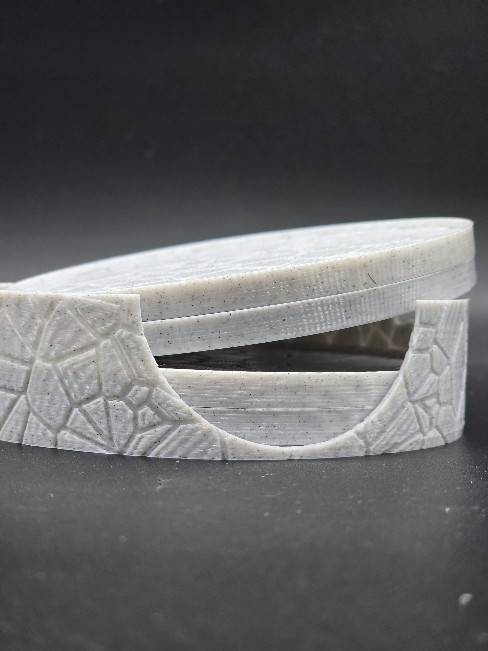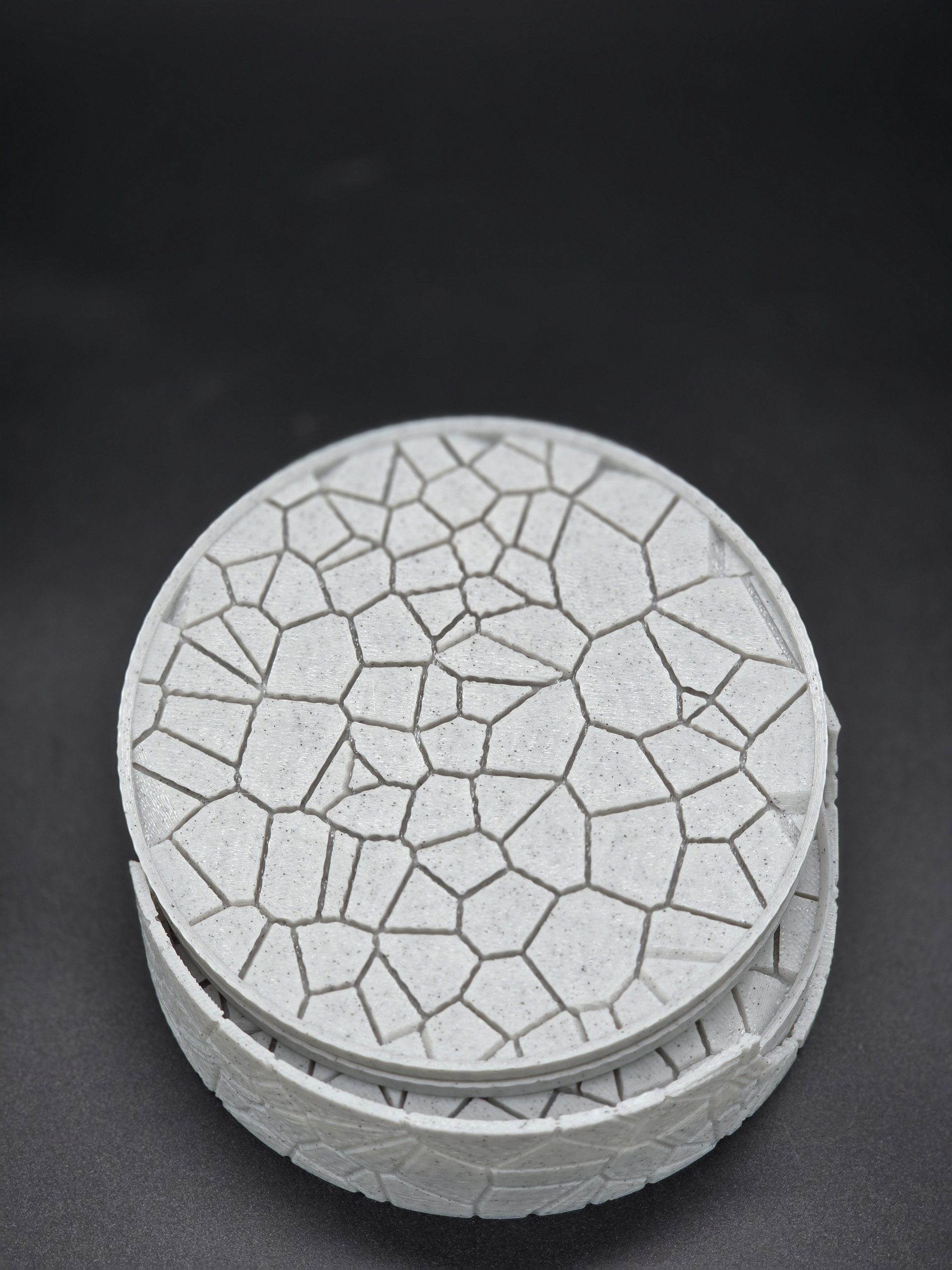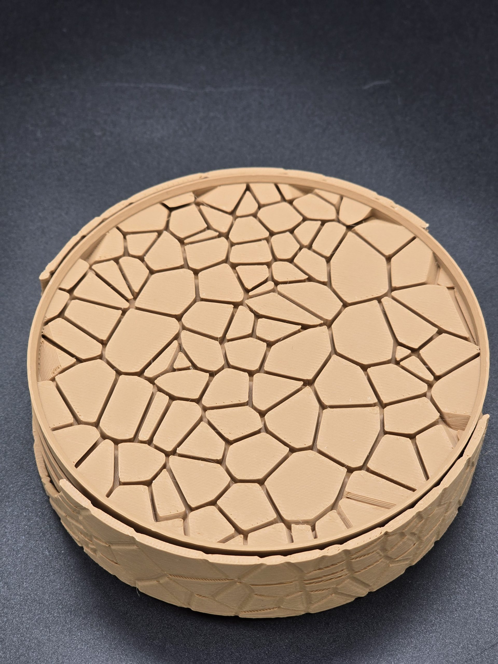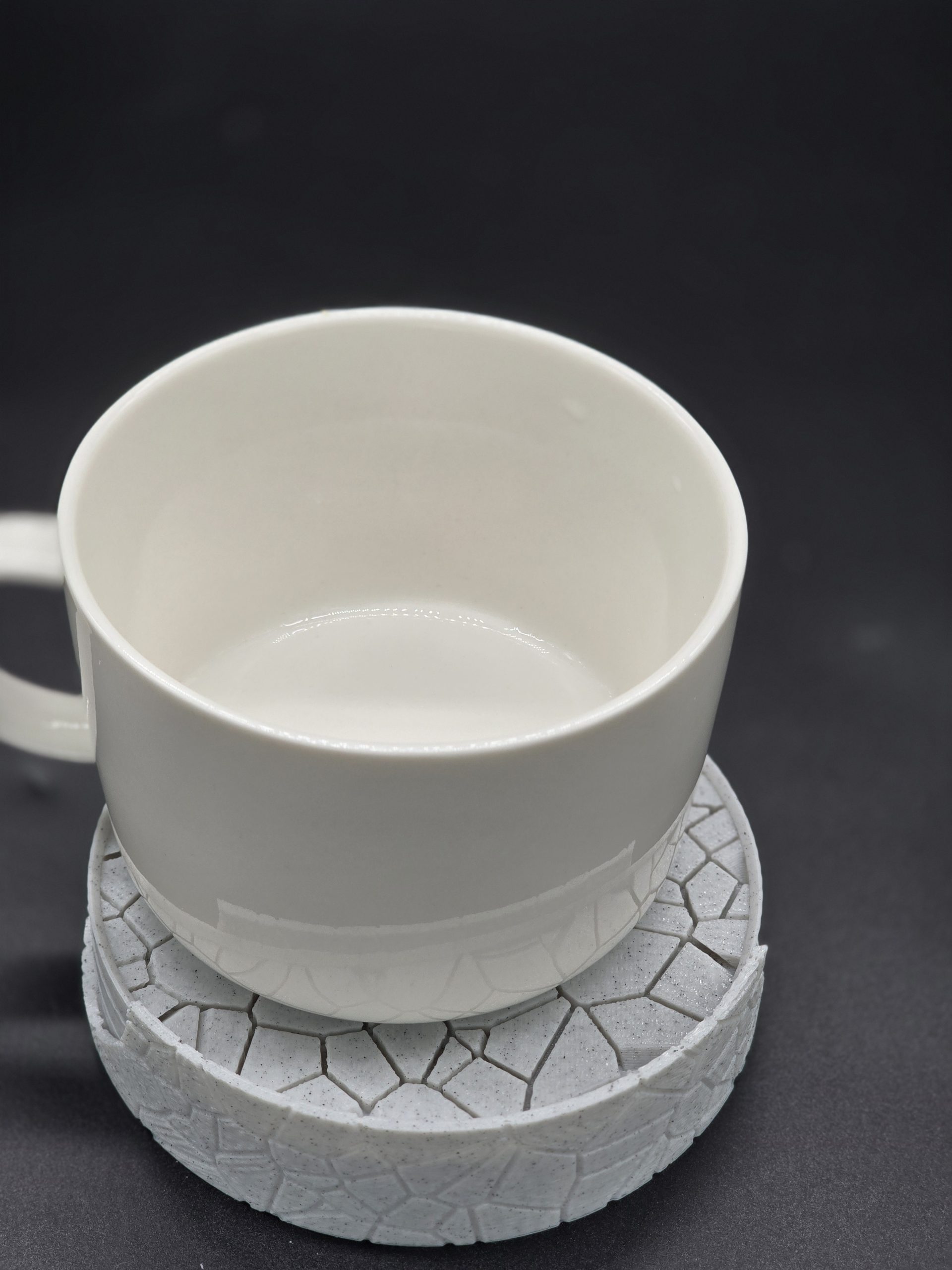 - “Tired of boring coasters? This one-of-a-kind 3D-printed design is a work of art for your tabletop. Each piece features a distinct, cobblestone-like texture that’s both unique and stylish. Perfect for gifting or for adding a custom touch to your own space.”