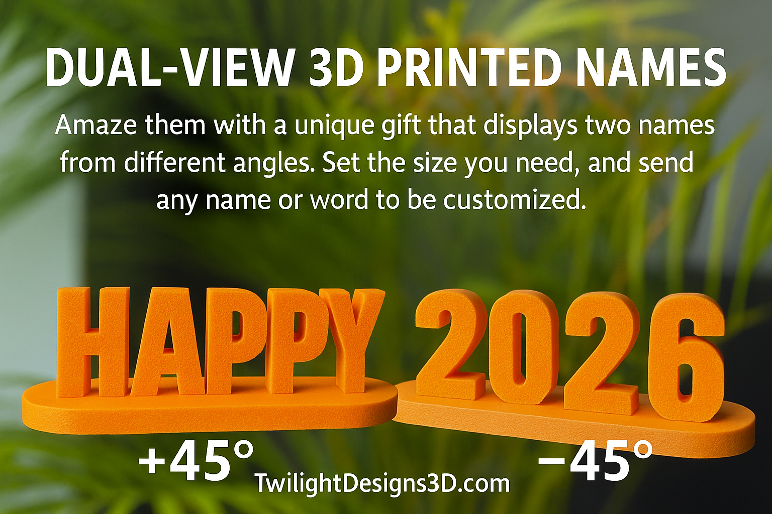Discover the magic of TwilightDesigns3D’s Dual 3D-Printed Creations — where two different names or words appear in one single 3D print. From one side, you see one name, and from the other, a completely different one — all crafted as one seamless, eye-catching piece.